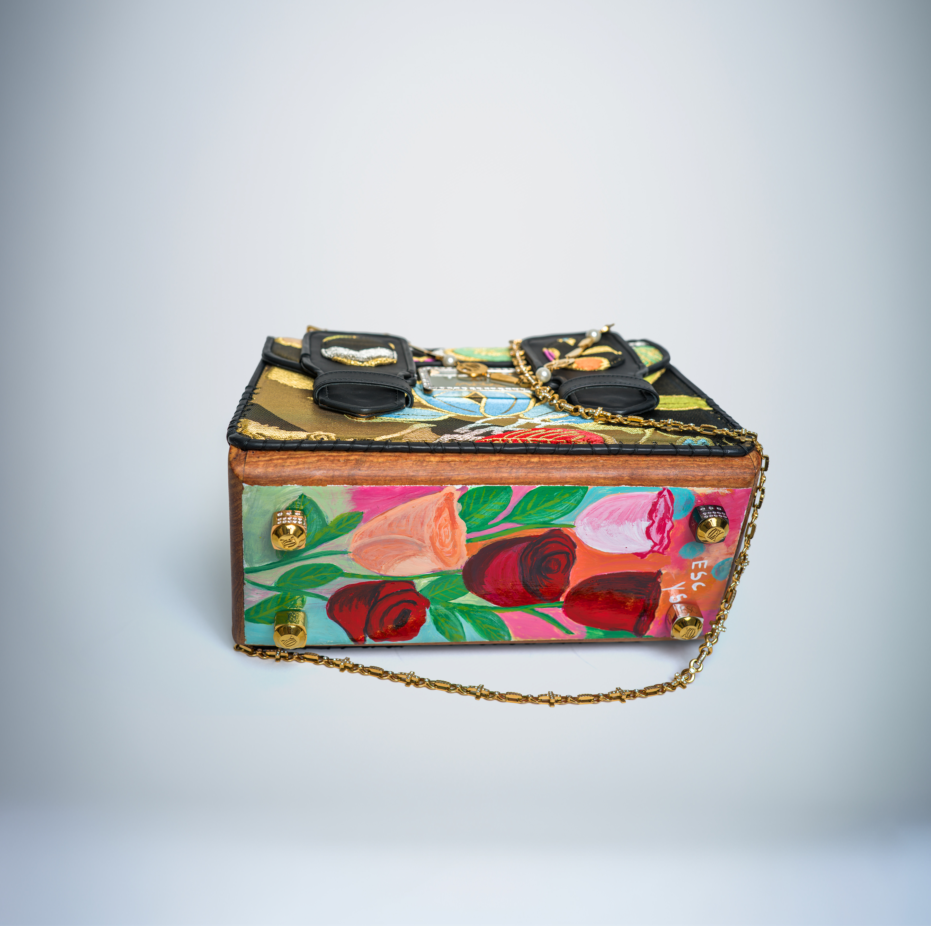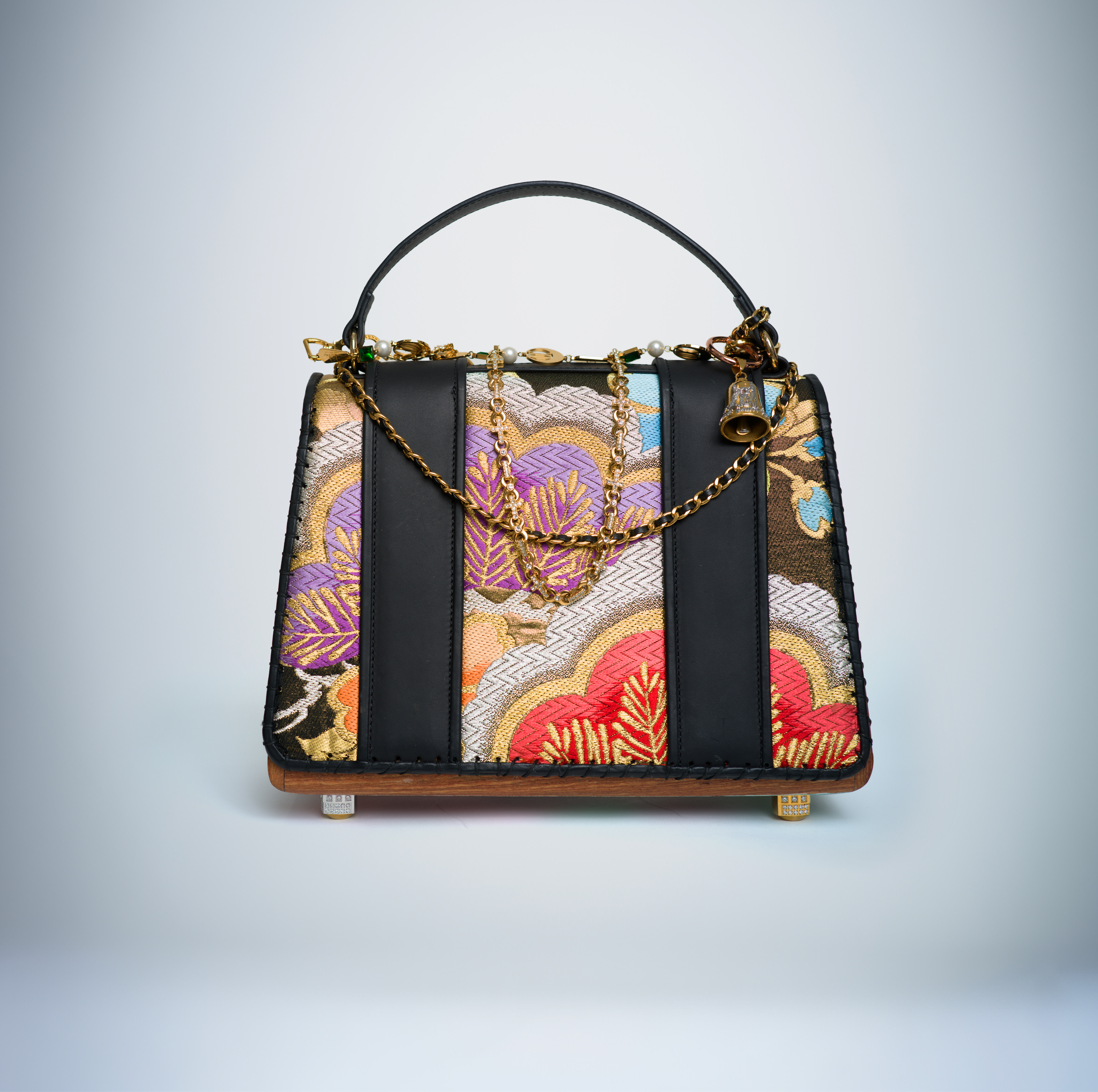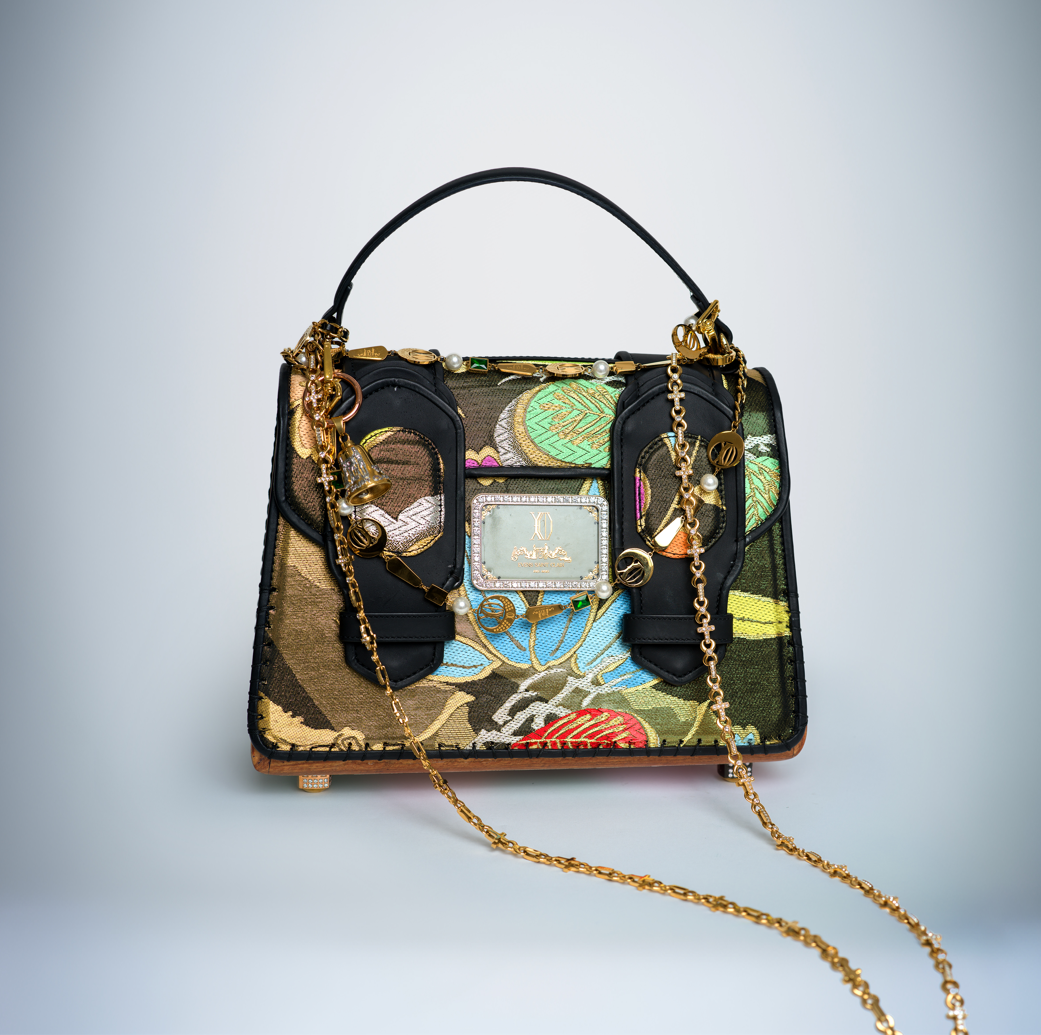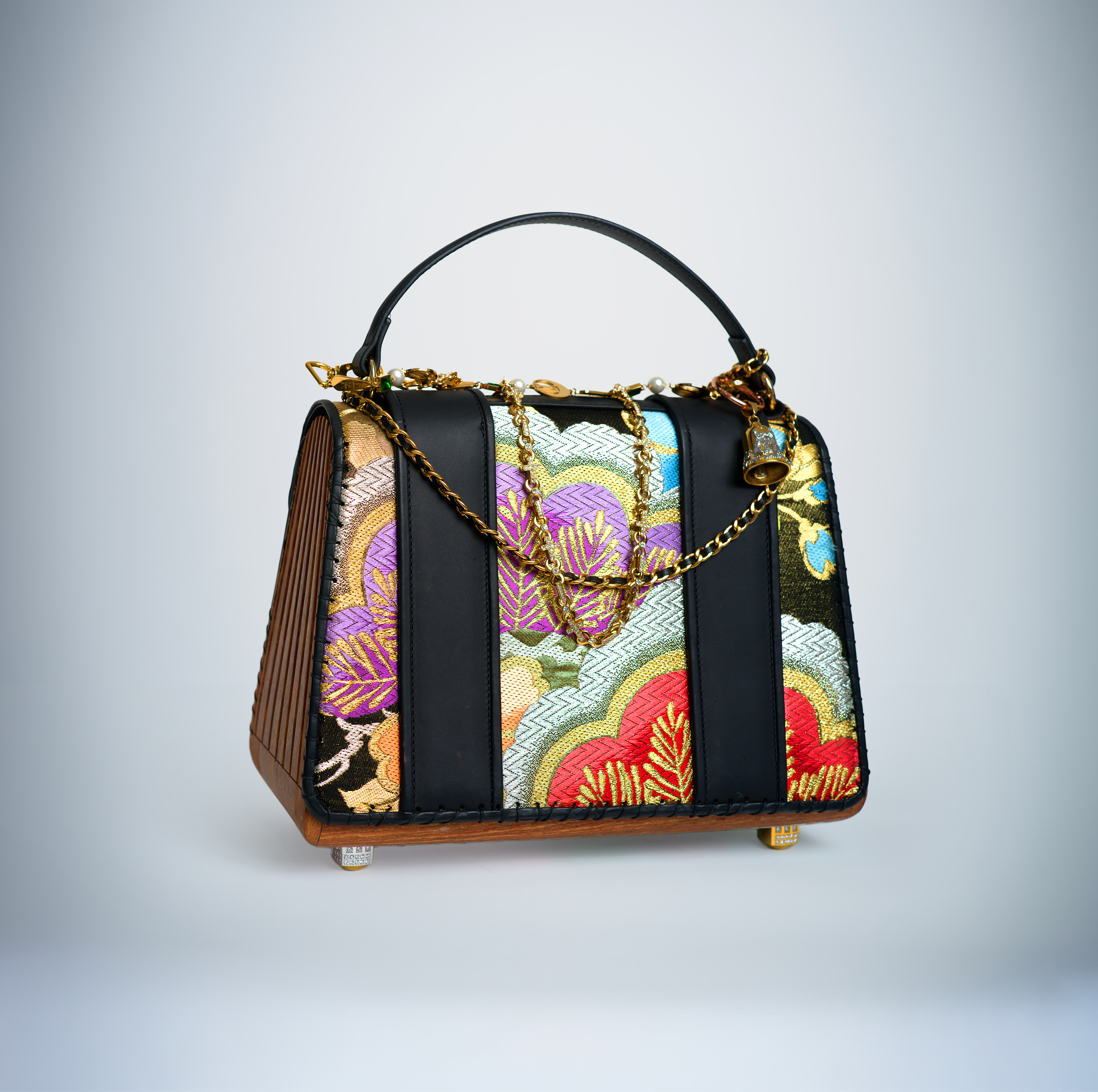 Across its surface, over 100 carats of diamonds ignite a celestial brilliance. Emeralds, set within golden chain links, echo the rhythm of nature’s vitality, while Burmese rubies, embedded with precision into each crossbody link, radiate fire and passion. Every element exists in harmony, wood, silk, stone, and gold, composing a silent symphony of craftsmanship and devotion.